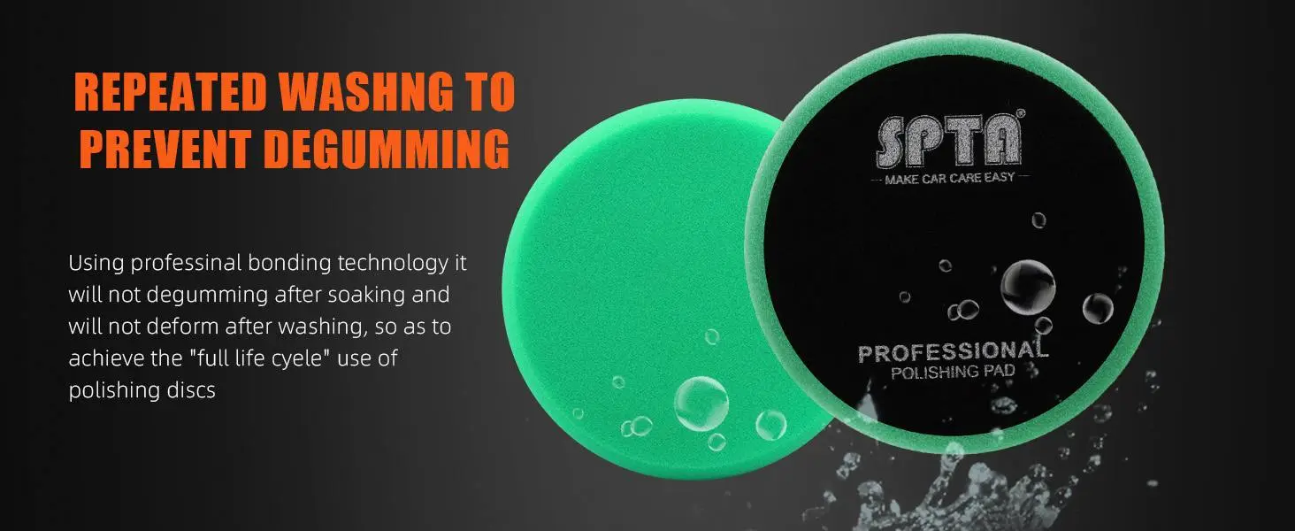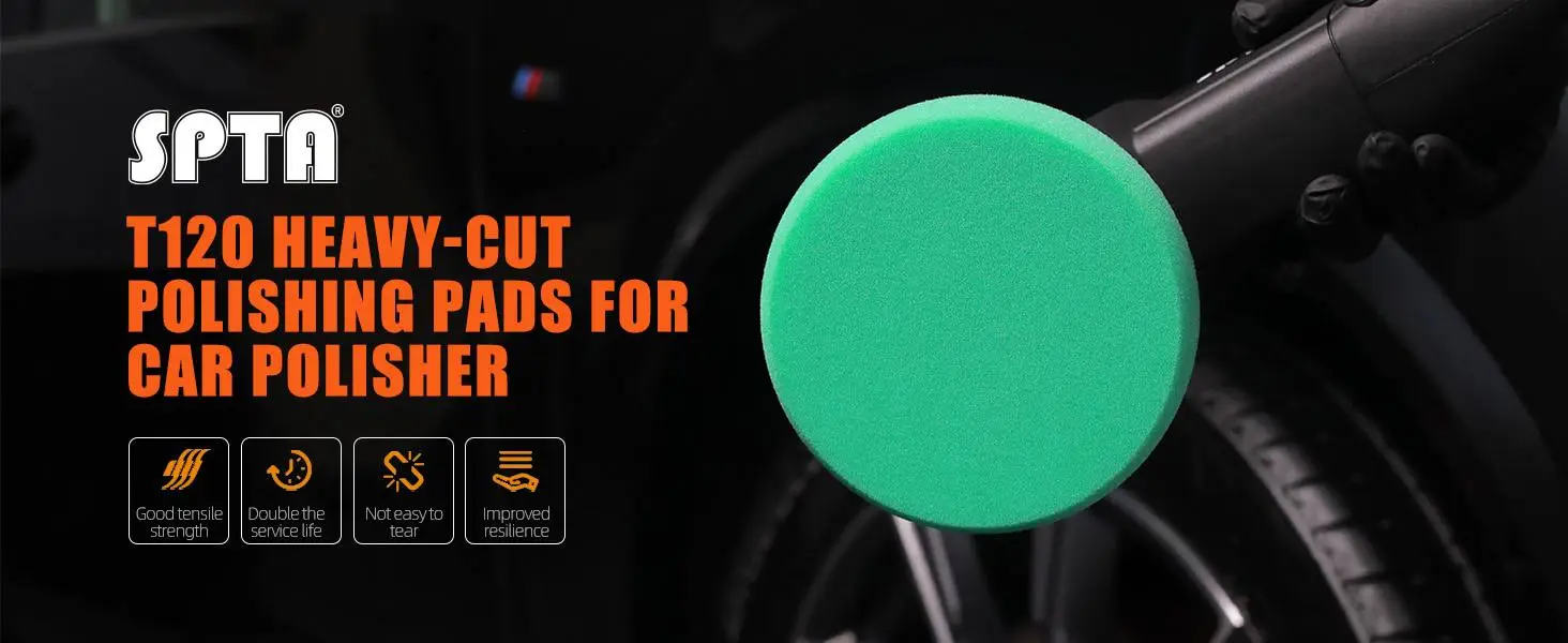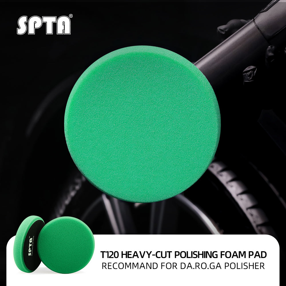 • SPTA 3 Inch to 7 Inch T120 Green Heavy Cut Foam Polishing Pad For DA/RO/GA Car Buffer Polisher To Remove 1200/1500# Sanding Disc Marks ,Deep Scratches,Overspray, Orange Pee & Heavy Oxidation