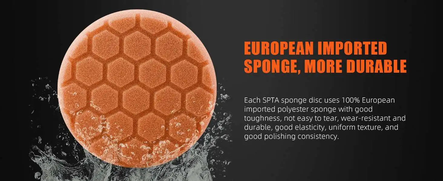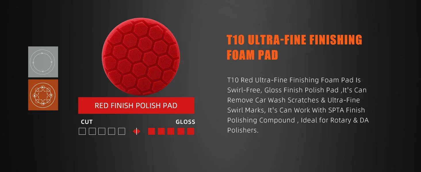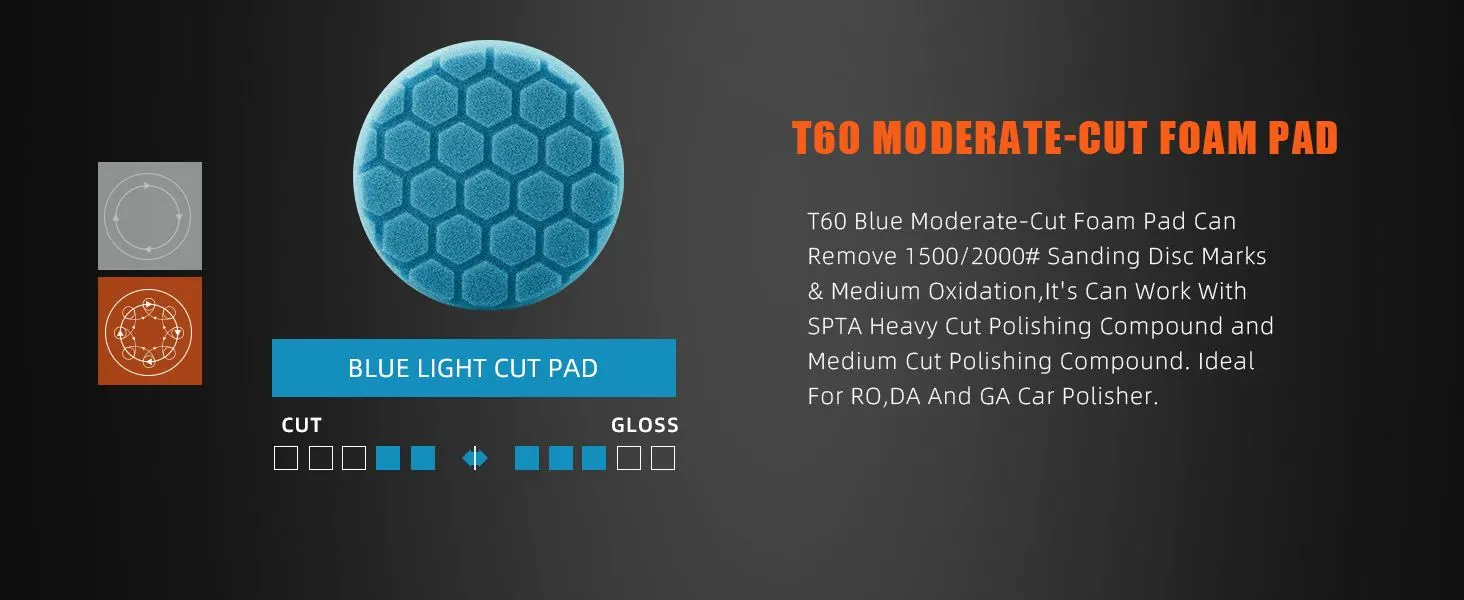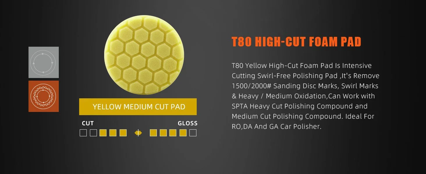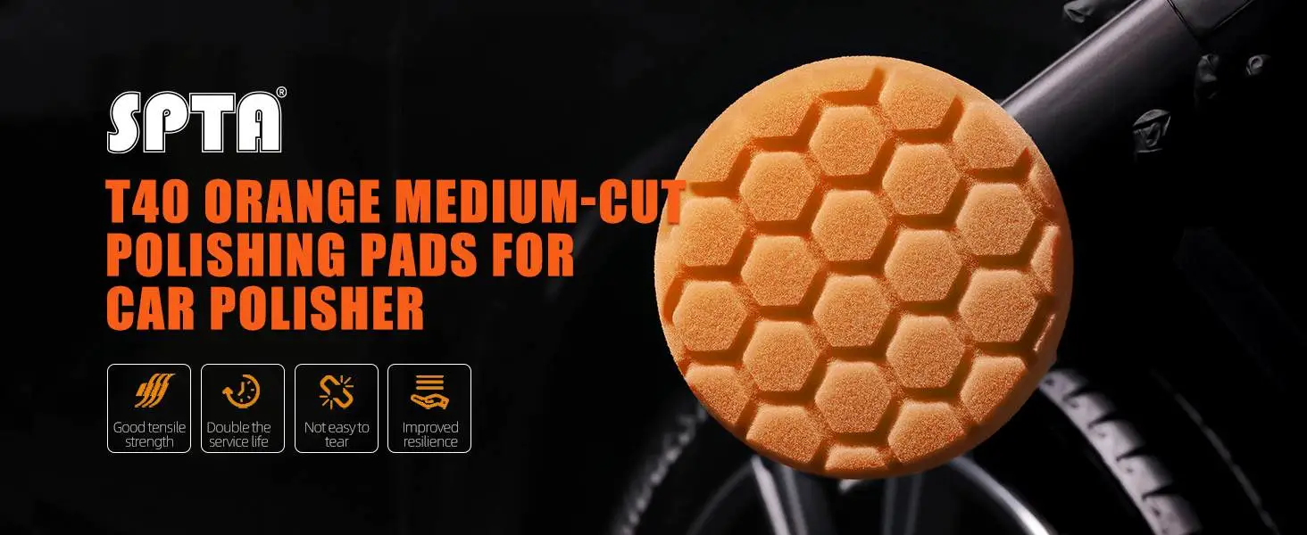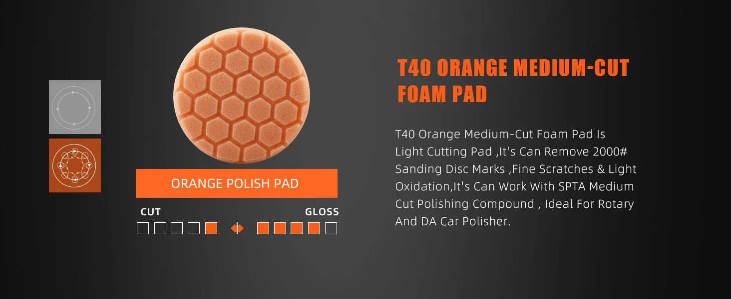 [Function] T40 Orange Medium-Cut Foam Pad Is Light Cutting Pad ,It's Can Remove 2000# Sanding Disc Marks ,Fine Scratches & Light Oxidation,It's Can Work With SPTA Medium Cut Polishing Compound , Ideal For Rotary And DA Car Polisher.