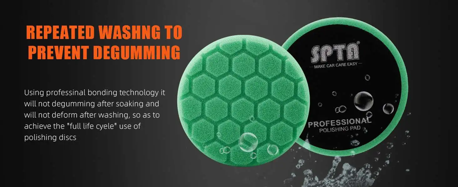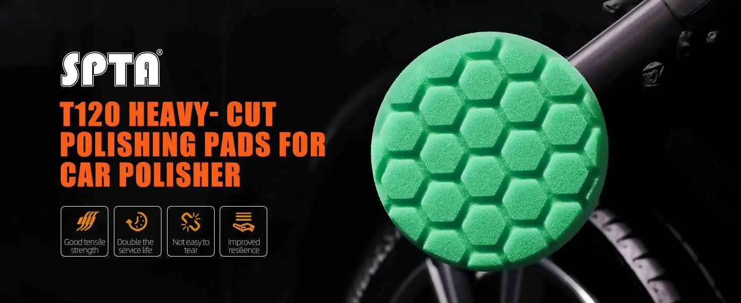 • SPTA 3 Inch to 7 Inch T120 Green Heavy Cut Foam Polishing Pad For DA/RO/GA Car Buffer Polisher Hex-Logic Buffing Pads To Remove 1200/1500# Sanding Disc Marks ,Deep Scratches,Overspray, Orange Pee & Heavy Oxidation