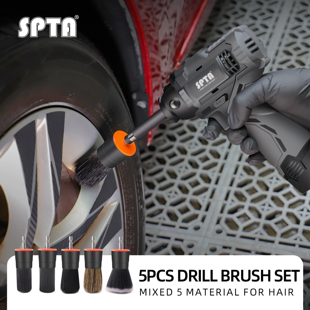 This interior detail brush set helps to wipe off all unnecessary things from your car. There are 5 different materialsfor different usages. Microfiber for cleaning exquisite surfaces(dashboard, center console); Boar hair aims to washing car exterior(wheels, lug Nuts & spokes); Synthetic fiber is good at cleaning air vents, leather seats and so on.